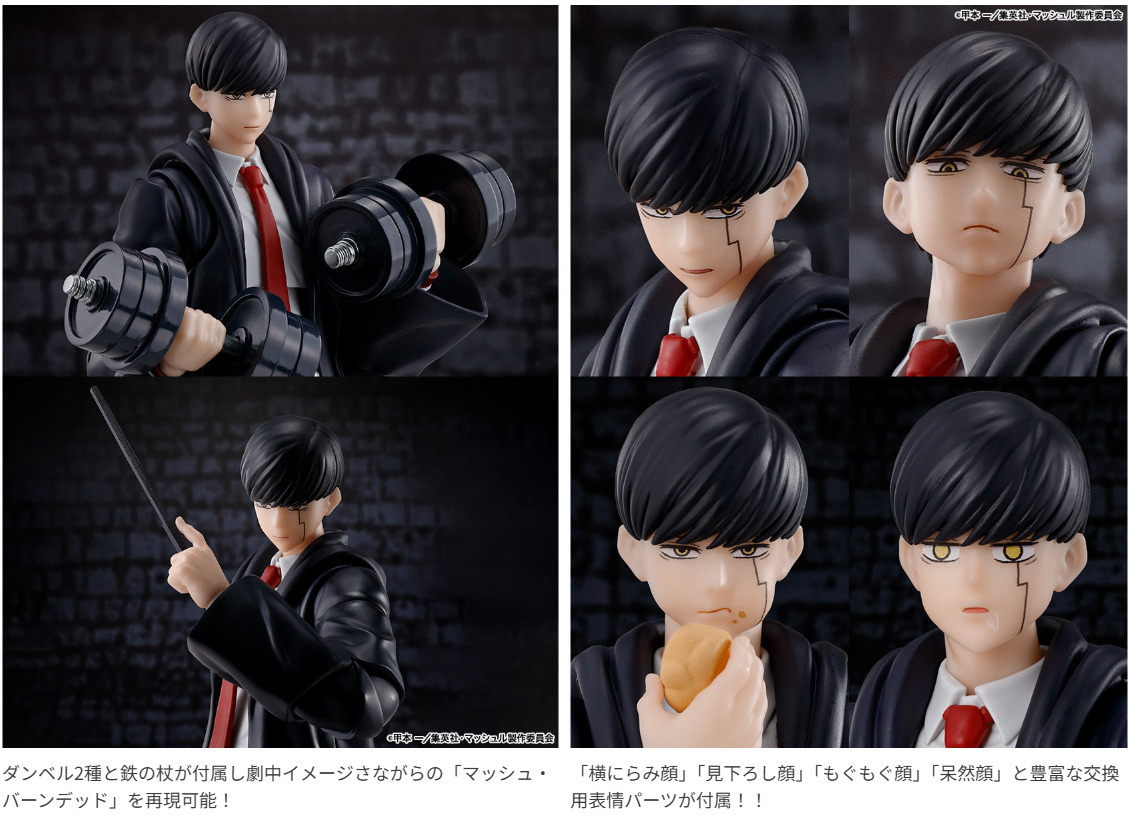 劇中イメージの造形・彩色で「マッシュ・バーンデッド」がアクションフィギュア化!!全身に加えローブに可動機構を採用することで、ダイナミックなアクションシーンを再現可能。交換用表情パーツ4種、鉄の杖に加え、シュークリームやダンベルといった「マッシュらしい」オプションパーツが多数付属!!