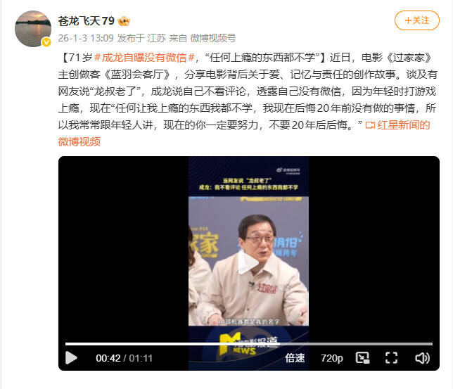 谈及有网友说“龙叔老了”,成龙说自己不看评论,透露自己没有微信,也不搞微博,平时都靠短信交流。因为年轻时打游戏上瘾,现在“任何让我上瘾的东西我都不学,我现在后悔20年前没有做的事情,所以我常常跟年轻人讲,现在的你一定要努力,不要20年后后悔。”
