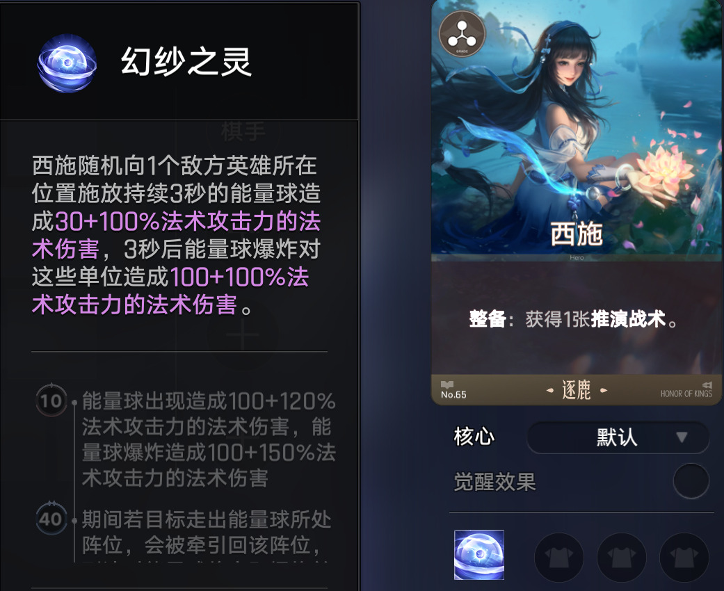 - 西施:回合开始获得一张推演战术,觉醒后给的是高级推演战术。对廉颇使用可以把廉颇的蓝条剪到10蓝,让廉颇频繁释放技能获得护盾并恢复生命值。