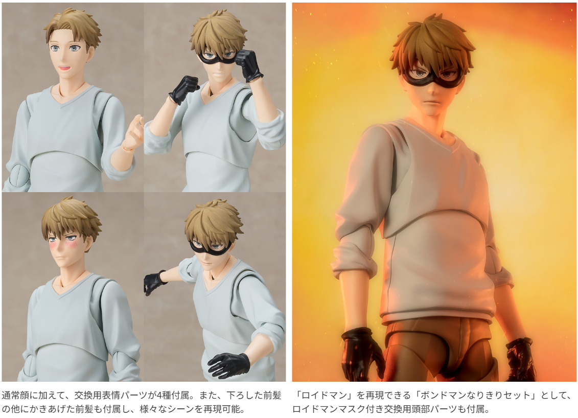 フォージャー家の“ちち”である「ロイド・フォージャー」の私服Ver.で立体化。豊富な表情パーツに加え、「ロイドマン」を再現できる「ボンドマンなりきりセット」として、ロイドマンマスク付き交換用頭部パーツや交換用手首(グローブ)も付属。