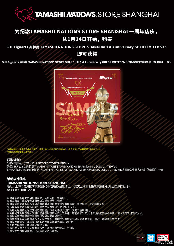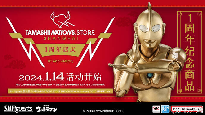 为纪念「TAMASHII NATIONS STORE SHANGHAI」开业一周年,初代奥特曼以GOLDColorVer.的式样于S.H.Figuarts系列登场
