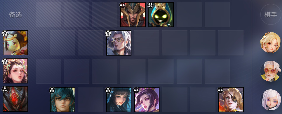 拍卖的话也是优先阵容中缺少的核心,之后就是按部就班,边刷蒙恬等级,边找机会升级棋手,一般压力不大的情况下,3级棋手搜2阶牌,4级棋手搜3阶牌,这样几率更高。等场上英雄都觉醒得差不多了,最后一轮拍卖看有没有机会直接升级1级英雄,让小妲己达到6级满级,这样西施可以让蒙恬每回合都减到10蓝,配合太乙,阵容大成。