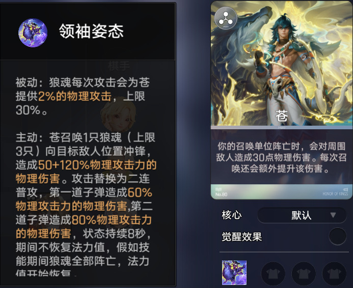 苍是召唤流的另一个核心,能让召唤单位阵亡时,造成物理伤害,技能本身也会召唤狼魂,100级召唤3道狼魂冲锋。