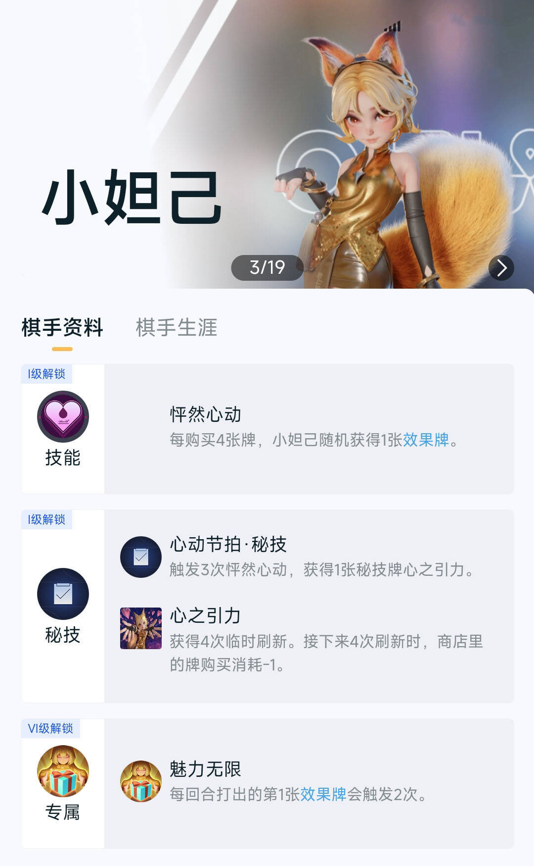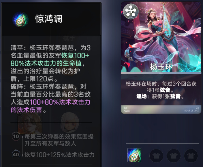 无论什么构筑和玩法,遇到同行或者商店刷不到关键1~3阶英雄牌时,看到杨玉环后购买、打出、出售,此时就可以获得弦音,使1-3阶英雄,觉醒进度+1。杨玉环觉醒后的弦音可以给任意阶的英雄觉醒进度加1,不过大部分时候都用不到这个特效,毕竟她自己本身想要觉醒也不是一件容易的事。