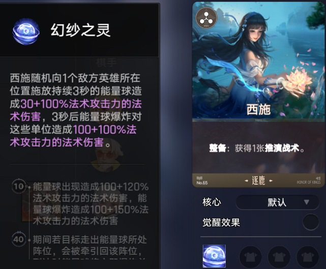 西施的主要作用是每回合获得一张她的推演战术效果牌,觉醒后获得是高阶推演战术,多次使用之后,这张牌可以减少英雄40点蓝,蒙恬初始80点蓝,需要打出两张高阶推演战术,或者搭配效果牌生效2次的棋手,就可以做到让蒙恬的蓝变为10点,此时装备每秒回5蓝的法源之杯,把蒙恬放到战场角落,用其他英雄来保护蒙恬,就能在角落里源源不断的召唤士兵大军。