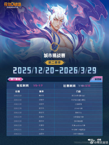 第二赛季城市挑战赛第一赛段迎来收官对决,2026年1月10日-1月11日开启第四周角逐,2026年1月5日-1月7日登录官方小程序进行报名,后续赛程将于赛事当周的前一个星期五准时发布,关注符文战场公众号获取最新资讯。