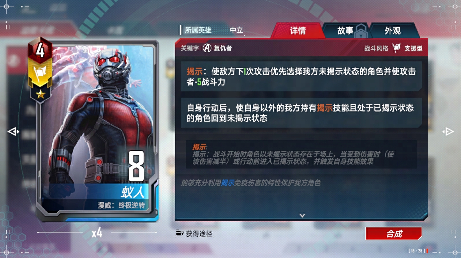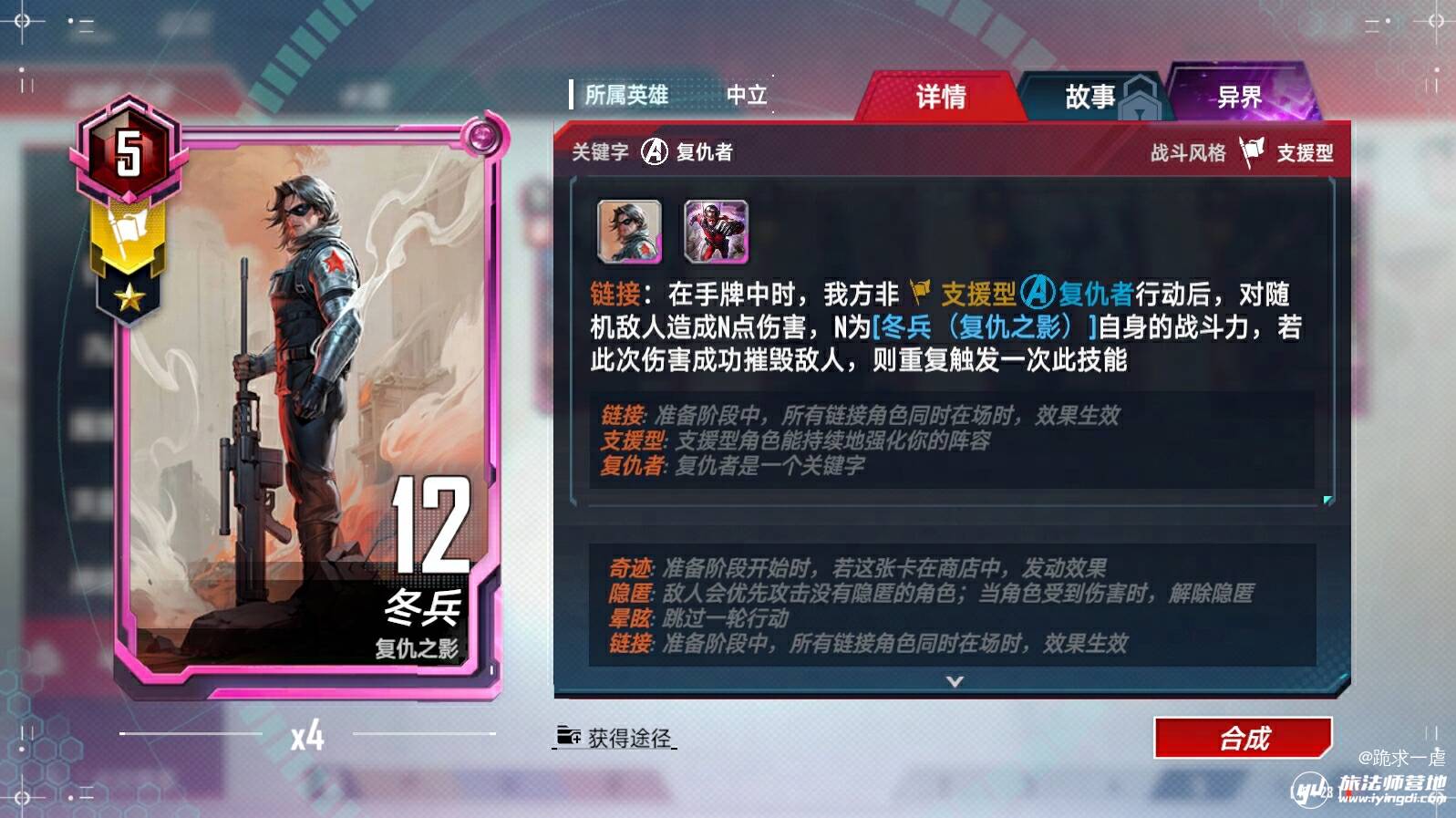<屹立>:战斗中,具有<隐匿>;对方费用不超过4/5/6的角色在攻击前,若攻击目标是其队友,或者此时其没有队友,则令我方另一个具有<屹立>技能的角色偷取其一半战斗力