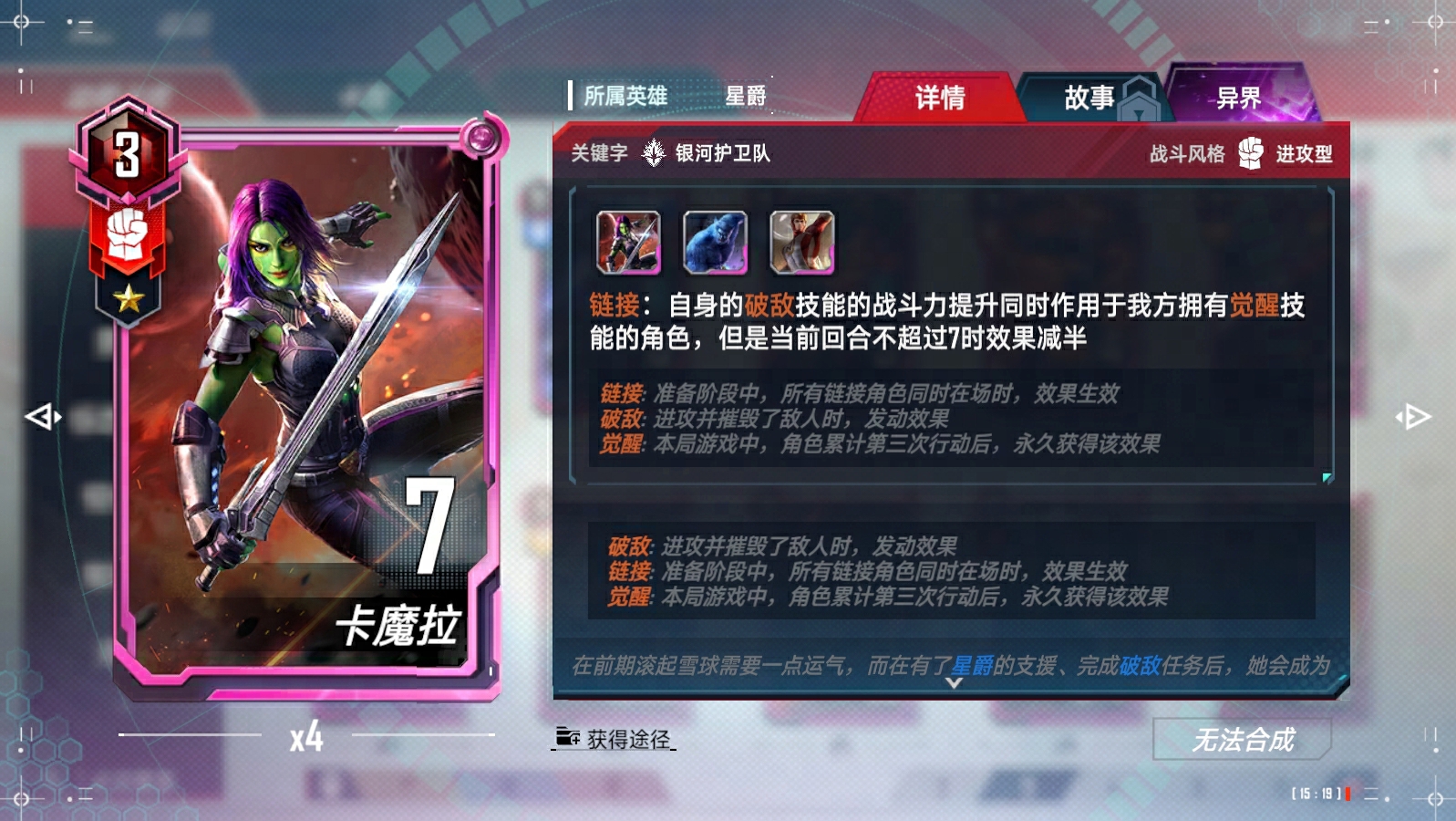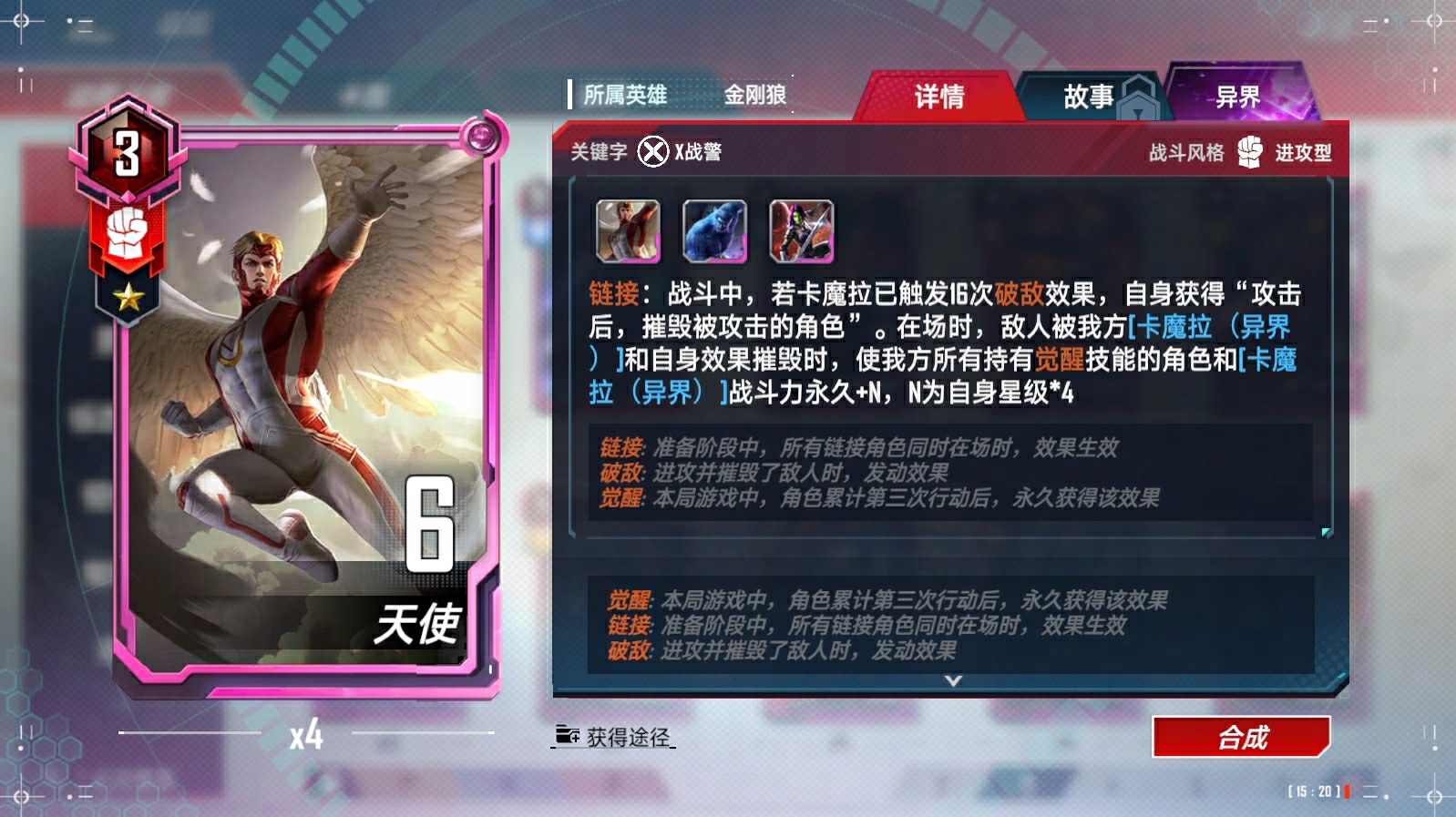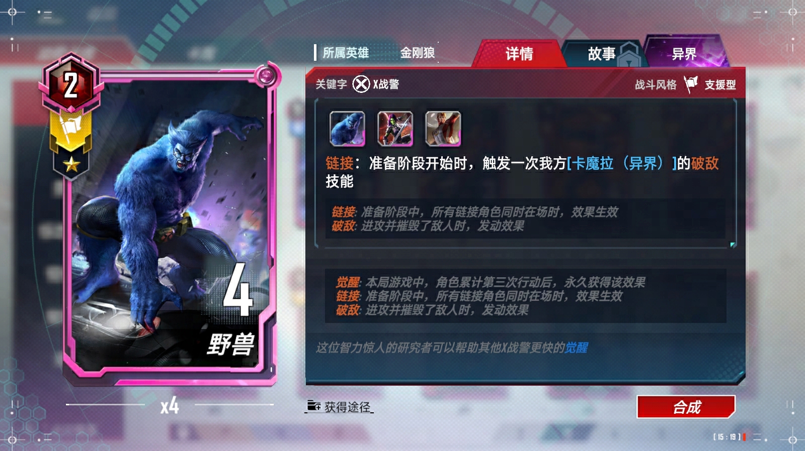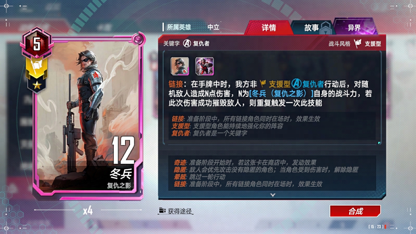 奥创(异界)、浪、苏尔特尔链接(与奥丁)、蜘蛛侠(迈尔斯·莫拉莱斯)链接(与尼克·弗瑞)、瑟西链接(与提亚姆特和马卡里)、马卡里链接(与提亚姆特和瑟西)、绝境装甲(异界)、凯伦·佩吉、X战警的集结、X战警的集结-终幕、洛基(仙宫陨落)、瓦尔基里链接(与阿斯加德天马)、克里亚链接(与奇异博士和奥马尔)、深红宝石、超智机构生化怪物、超智机构士兵链接(与魔多客和超智机构生化怪物)、泽莫男爵(秘密帝国)(异界)、蜘蛛侠链接(与黑猫等)、叶莲娜(漫威影业 黑寡妇)链接(与黑寡妇(漫威影业 黑寡妇))