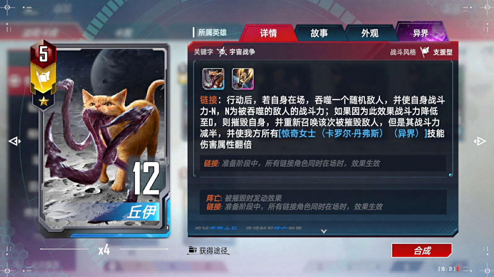 战斗中,我方<支援型>角色或<奥创复制体>被摧毁时,自身+N战斗力,N为该角色受到的过量伤害的一倍/两倍/三倍;若该角色不是<奥创复制体>,则再召唤一个<奥创复制体>