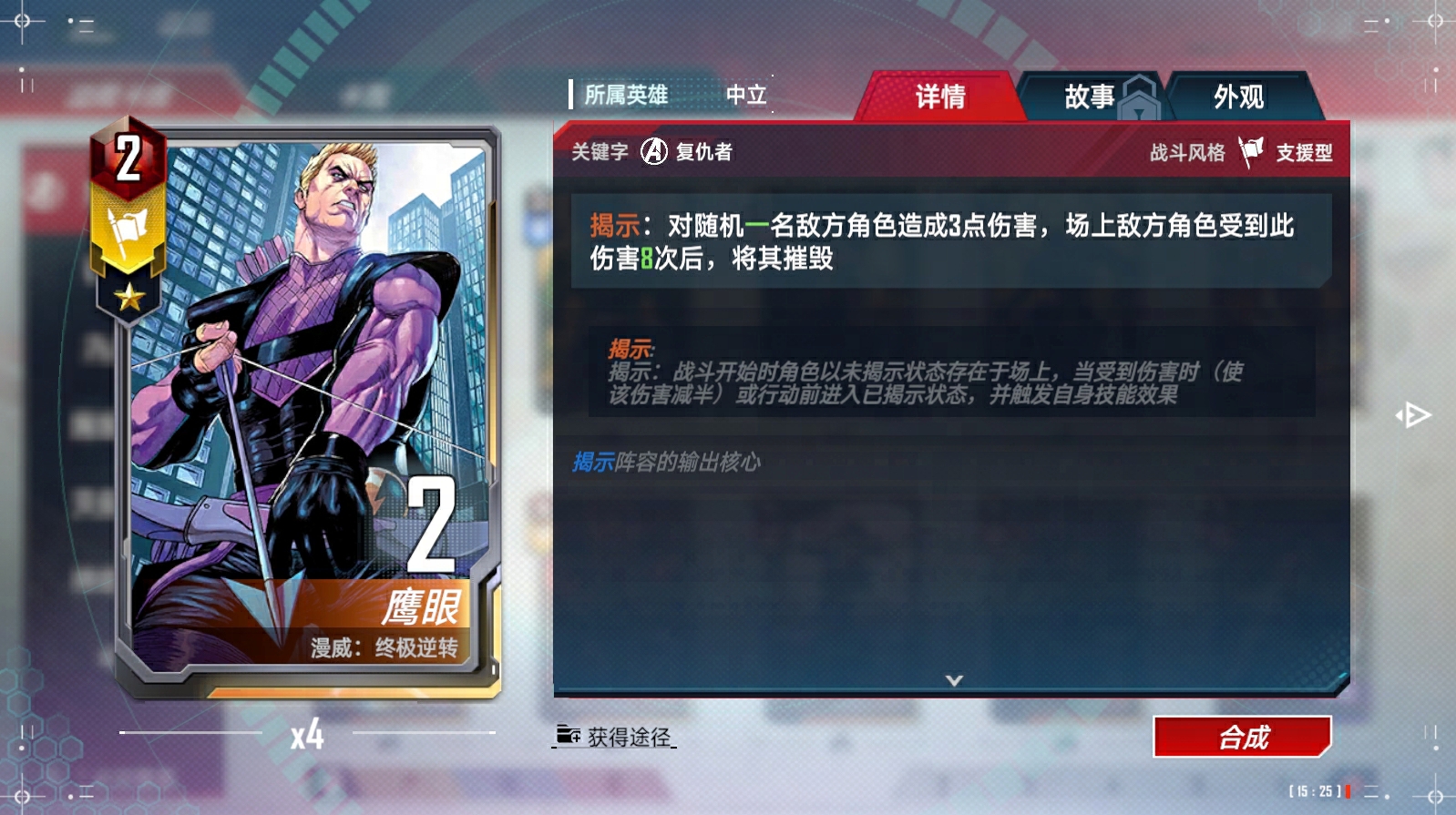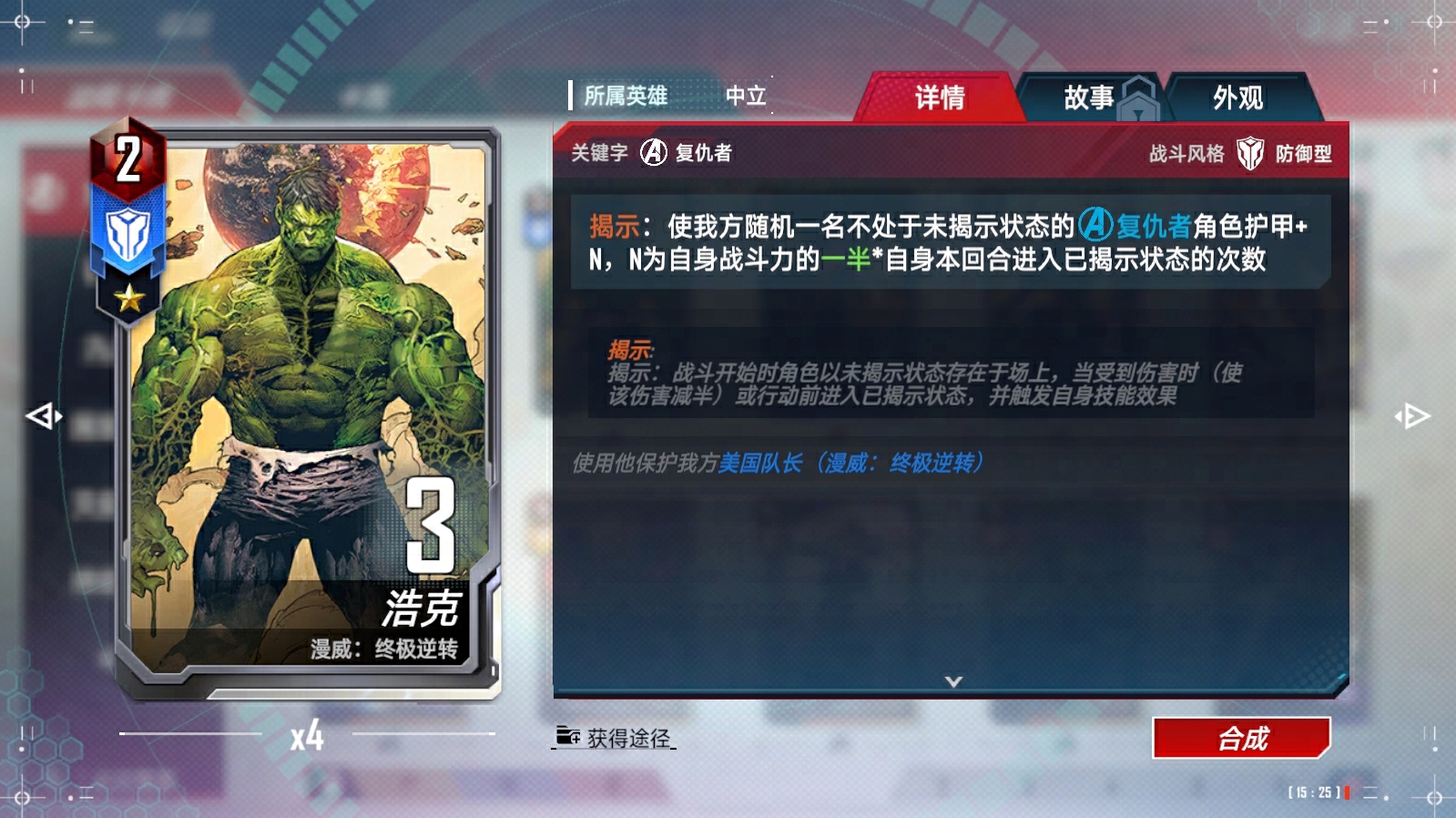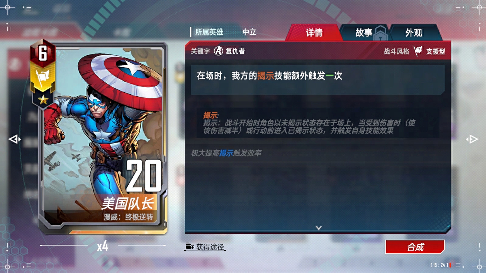 每回合我方首次打出<任务>牌时,在手中生成一张费用3/4/5的<进攻型><漫威骑士>角色牌