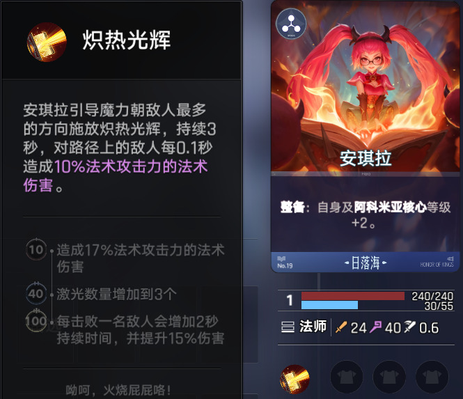 日落海的前中期的最强主C,后期看情况,如果血量告急,没有机会继续培养其他C位,当成唯一C位培养也是可以的,安琪拉40级以后激光数量增加到3个,这个时候就算等级略低于对手,也可以造成爆炸输出,有法系输出装优先给她。