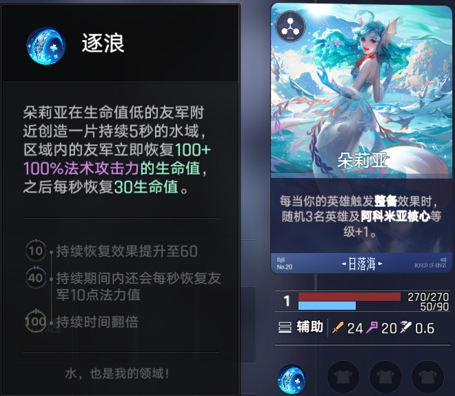 朵莉亚是日落海英雄提升等级的绝对核心,类似三分体系的小乔,触发其他英雄的整备时可以给英雄和核心提升等级,不缺战力时,觉醒优先级最高。