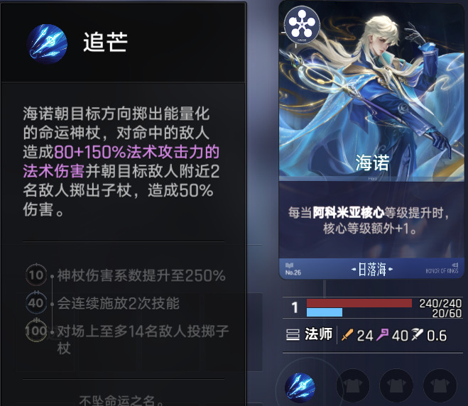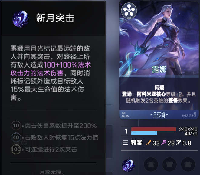 在场上其他英雄都凑齐之后,露娜在后期可以帮日落海阵营进一步提升等级,也可以作为一个刺客C位,用来切对手后排。如果有能量改造天赋,露娜是必备核心,有和没有区别巨大。