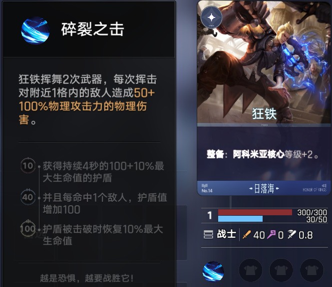 狂铁是前期非常优秀的英雄,他的整备效果可以提升核心等级,核心的默认效果是开战时给予场上日落海英雄临时等级。