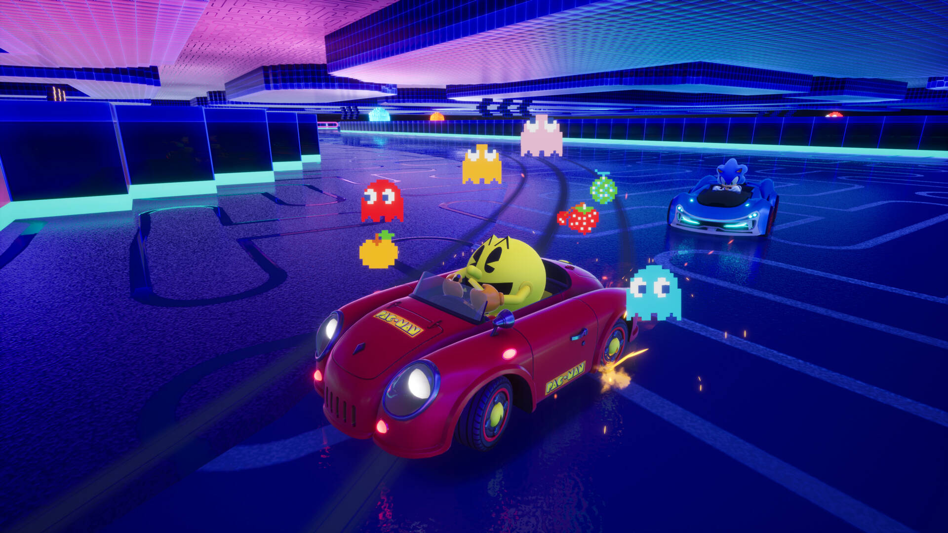 “PAC-MAN”与“Blinky”将作为赛车手加入游戏,“Inky”,“Pinky”和“Clyde”则将作为皮肤登场。此外,以“PAC-MAN”的关卡为主题的联动赛道“PAC-VILLAGE & MAZE”,以及联动赛车“PAC-MAN Mobile”也将亮相。点唱机追加《PAC-MAN》歌曲,可在游戏中作为BGM播放。