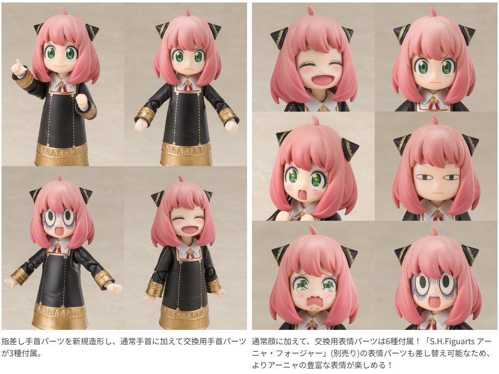 アーニャらしいポーズをとるための交換用手首や交換用表情パーツが付属。