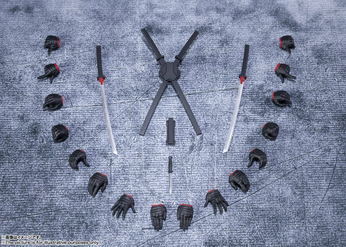 付属武器パーツで幅広いポージングが可能。背中に装着できる「刀(収納状態)」は柄の部分が取り外し可能で、鞘としても使用できる。