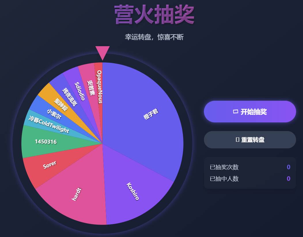 举例说明:张三打赏了500营火,李四和其他人打赏100营火,那么转盘如下,等于打赏多会增加你中奖的机会,但是并不能保证一定会中。