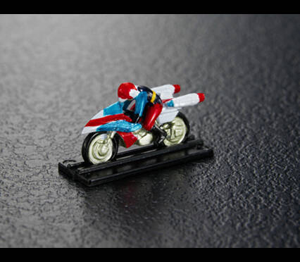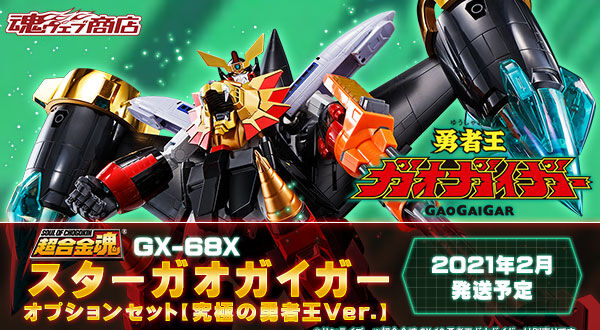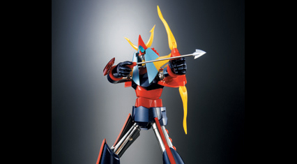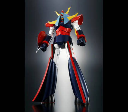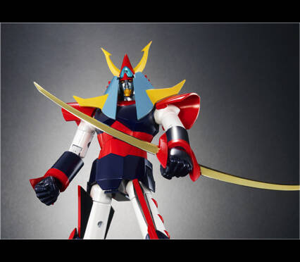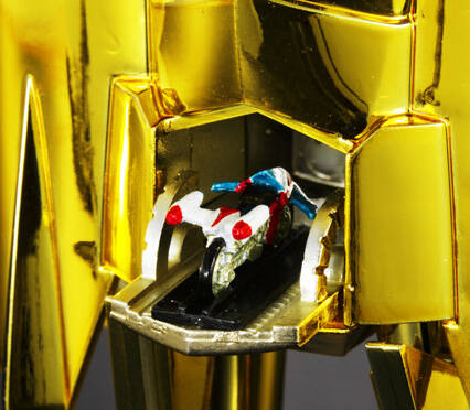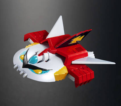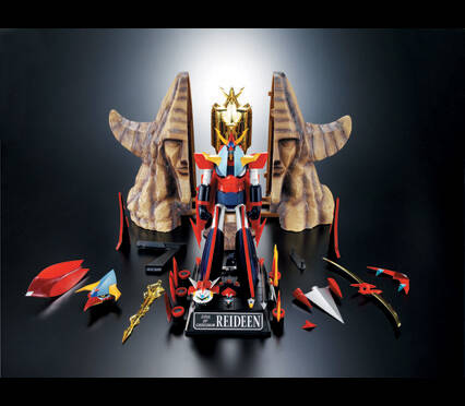 この「DXフェードインセット」では、劇中のフェードイン時のシチュエーションを再現できる、ライディーン神像、神面岩(開閉式、神像収納可能。全高230mm、収納時全幅215mm、展開時全幅330mm)、そしてひびき洸が搭乗するスパーカーがセット。通常版に付属する主要武器やブルーガーに加えて、ヘッドカッターやゴーガンソード等の強化武器も付属します。ライディーン本体は、上腕部と大腿部がパールホワイト塗装となっており通常版と異なります。