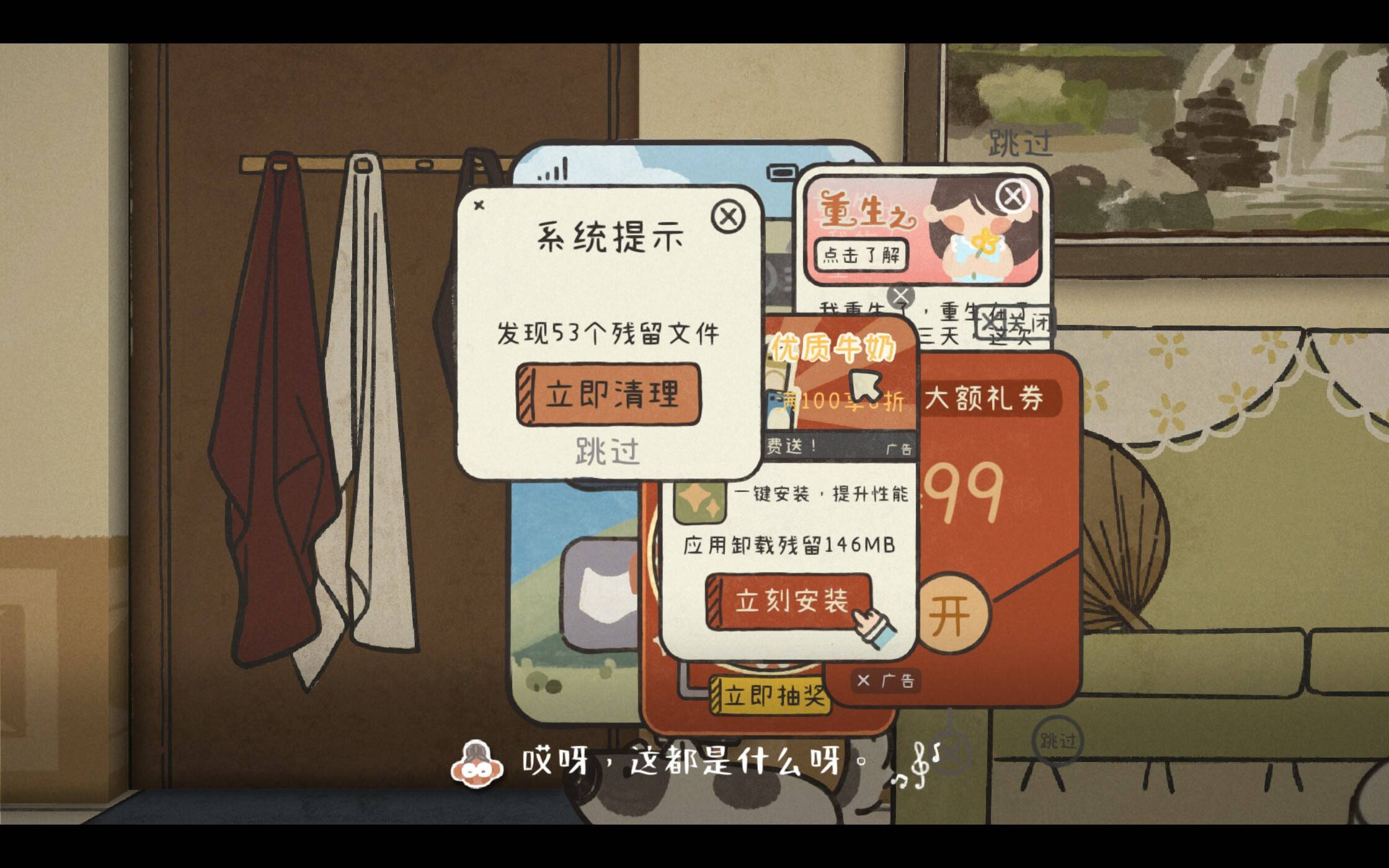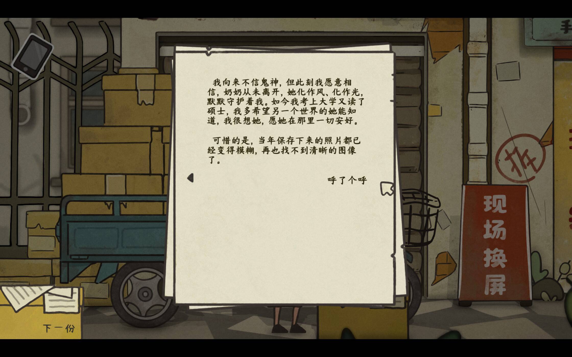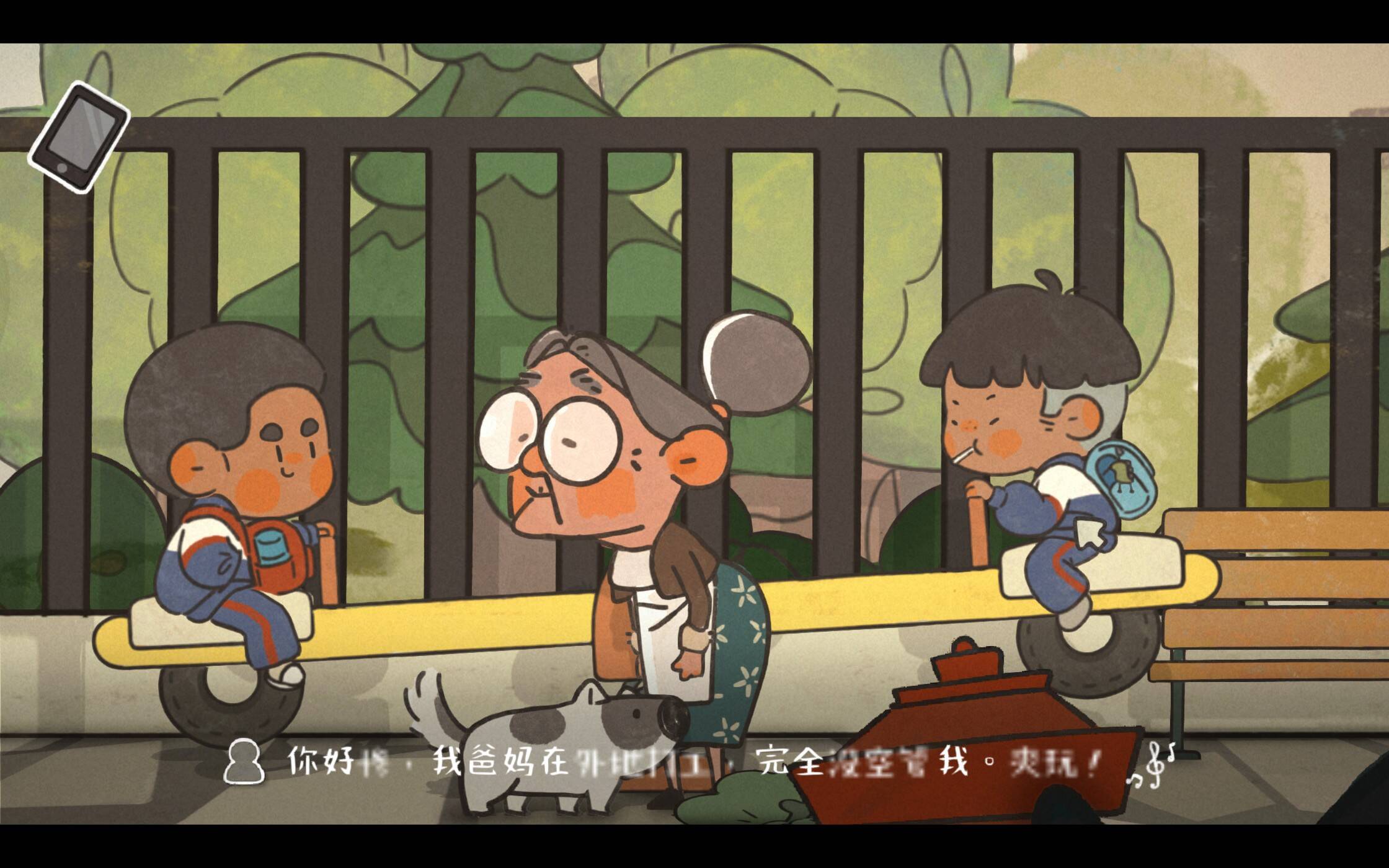 王桂花的女儿雯雯住在省城,这次打电话来就是为了接她去省城医院治疗听力障碍。但为什么这些字如此模糊呢?这其实是工作室的特别设计,通过文字模糊的形式让大家从另一个角度去感受听力受损后的世界。仔细看,手机右下方的音量还未调大,所以雯雯说的话都是模糊不清的。这一点对应了听障老人总需要大声说话才能听清的现实,而此般用心的细节在游戏里比比皆是。