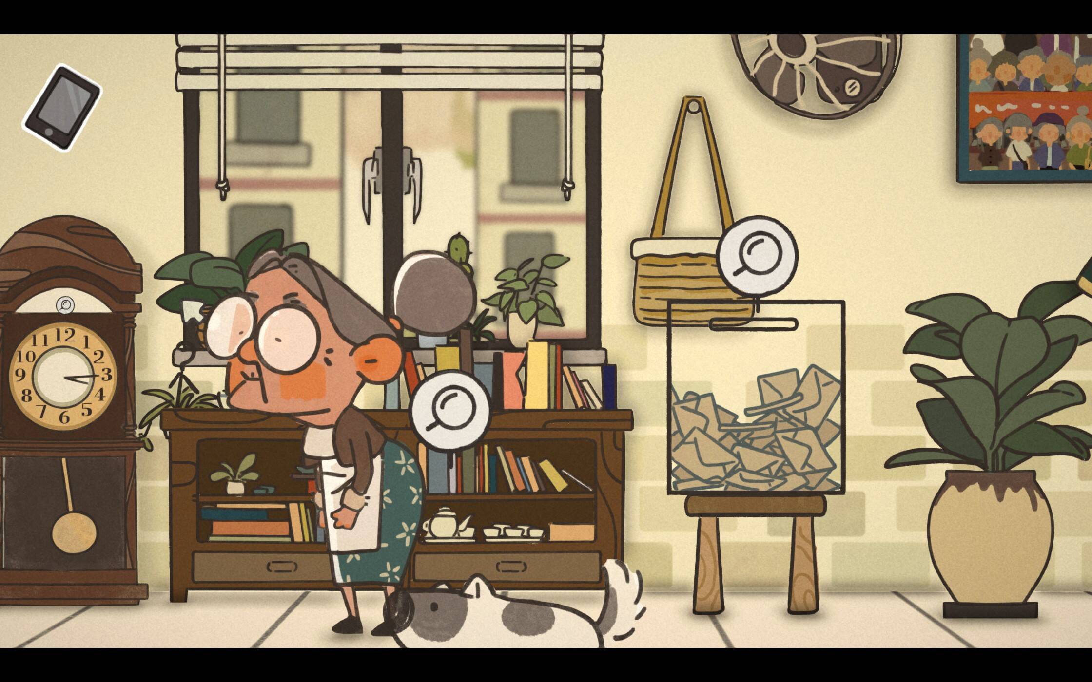 这里是老年活动中心,是王桂花与老友们经常聚会的地方。当奶奶靠近摆钟的时候,会听见“滴滴答答”的声音,拉开距离则会消失。右侧的箱子里放了许多书信,都是真实的读者来信,记录了许多年轻人与自家长辈的点点滴滴。(小白很乖,无论我们往哪儿走,它都会跟着。不过,后面可有我们得跟着小白走的时候哟~)