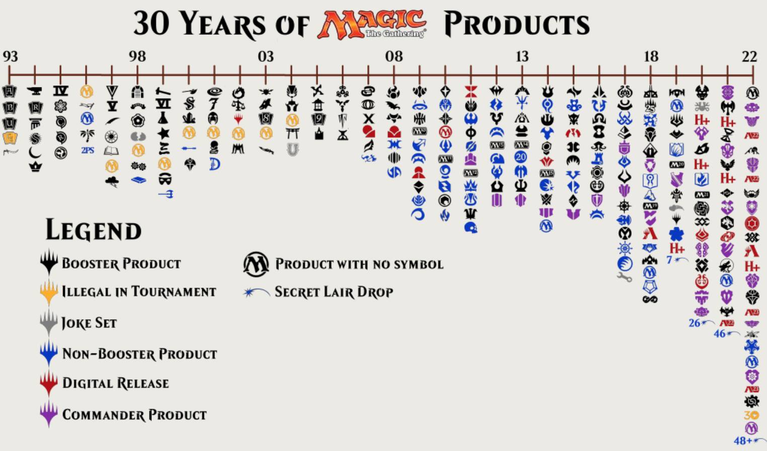 具体来说,股东原告声称,在科克斯的领导下,孩之宝公司印制了过多的《万智牌》系列,从而降低了现有系列的价值。对于资深的《万智牌》玩家来说,这种抱怨或许并不陌生,因为威世智公司每年印制的系列数量也远超以往。由用户jacobwillson2727在Only on Tuesdays网站于2022年制作的这张简明图表清晰地展示了这个问题,而且此后情况愈演愈烈: