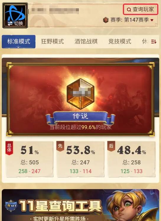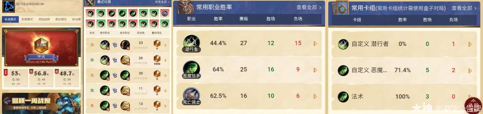 就能看到搜索人各个模式的战绩、对局记录、查用职业胜率、常用卡组等,点击对战记录就能看到双方选手的卡组。