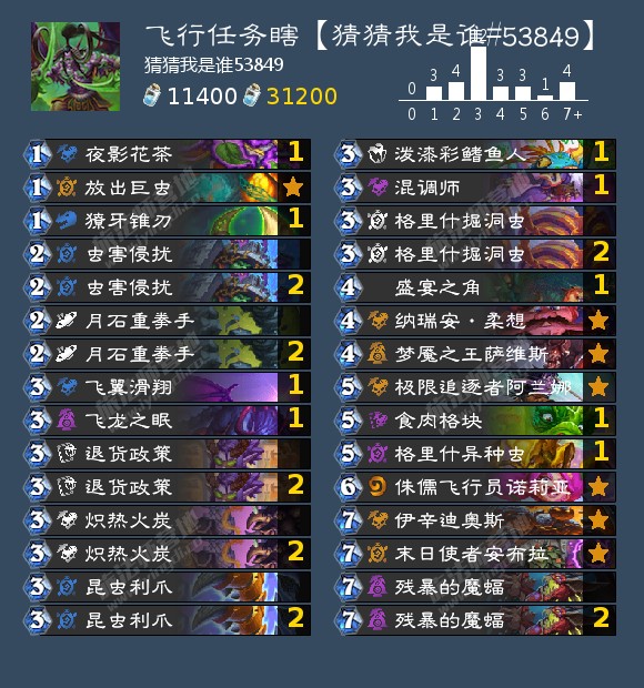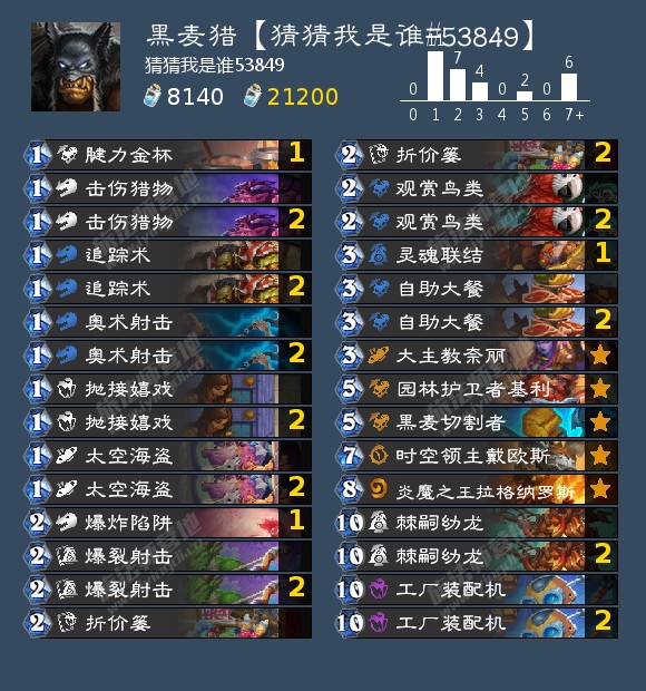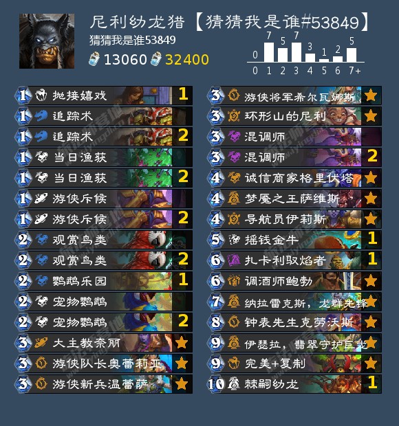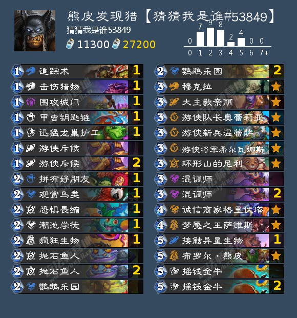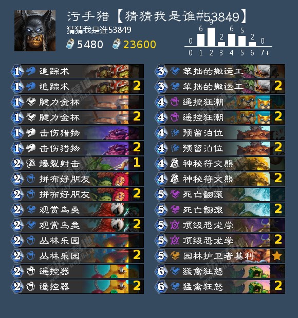 说明:这是一套常规的半otk卡组,实际玩起来胜率还是比较高的,因为在我的分段基本没见别人玩过,因此推荐给大家。大部分情况在5费左右能做完任务,胡牌的情况下4费完成任务,5费当回合用鹦鹉乐园+提克和托克+恐鳞追猎者,基本就赢了,每局对局都很快:前期通过狂野的卡牌包+拼布好朋友+业务支猿+巴拉克·科多班恩快速完成第一阶段任务,中期通过追踪术+观赏鸟类+大主教奈丽+梦魇之王萨维斯来检索穆拉克,以完成第二阶段任务。
