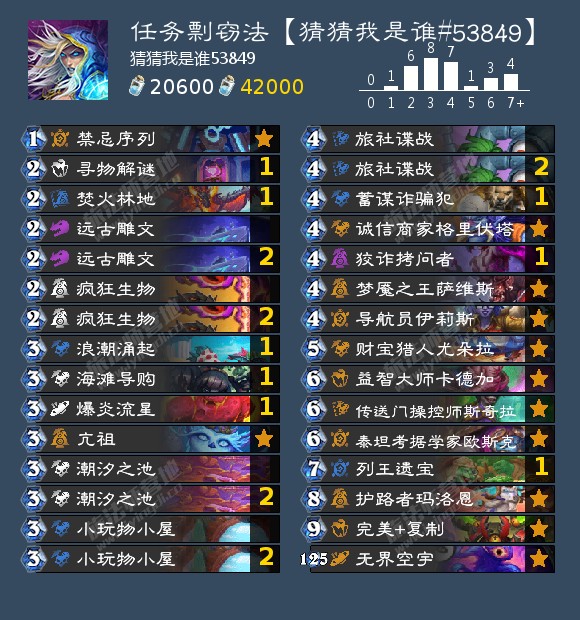说明:这套卡组我觉得挺有娱乐性,在随机性本就很高的任务法的基础上,近一步通过游客体系叠加了盗贼的剽窃卡:旅社谍战+财宝猎人尤朵拉,尤其是法师任务奖励配合尤朵拉的任务,可以获得2个宝藏+触发4个宝藏,同时还带了亢祖、泰坦考据学家欧斯克等冷门卡,近一步提升了游戏的新鲜感。