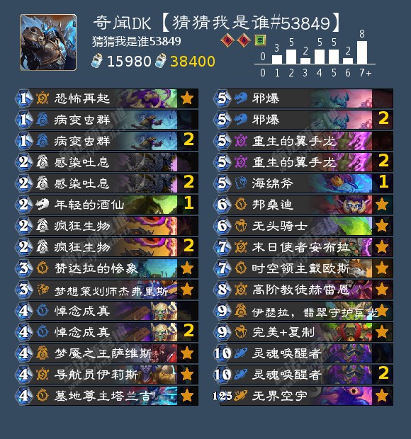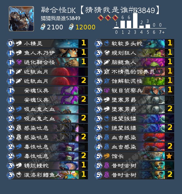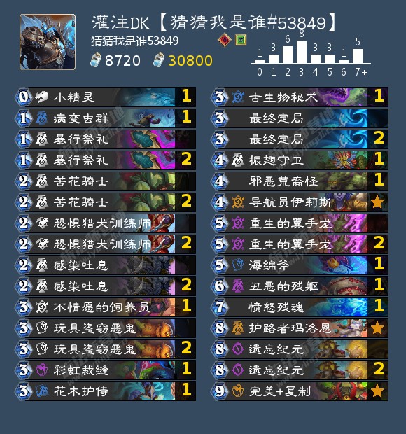 说明:这算是一套平平无奇的中后期卡组,唯一的亮点是把DK的任务和奇闻组合在了一起,等于有了两重高质量亡语。由于除了新版本初期之外,后来也没见人玩过DK奇闻,因此分享。