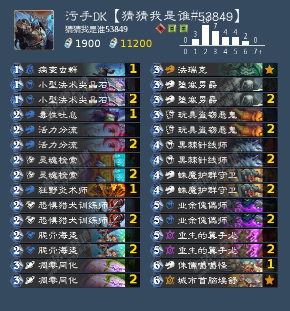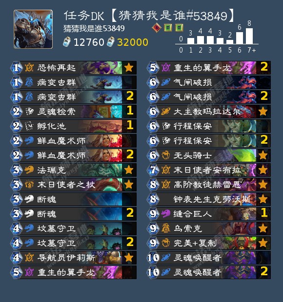 说明:DK的任务是公认的弱,标准天梯里几乎是见不到的。这套构筑来源于我上一篇文章一个老哥的留言,是在亡语体系的基础上叠加了任务,还是具备一定可玩性的。