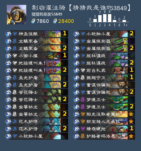 说明:这套卡组我强烈推荐,是一套百玩不腻的卡组,本质是剽窃骑(斗寿骑)的基础上叠加了灌注体系以润滑曲线,趣味性和随机性主要是剽窃体系组成的,小偷小摸+旅社谍战+前台礼宾+财宝猎人尤朵拉+阳光汲取者莱妮莎,可以生成无数种超展开的可能性,趣味十足。