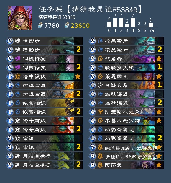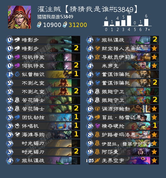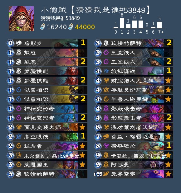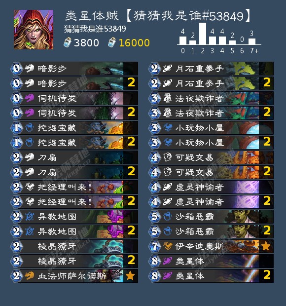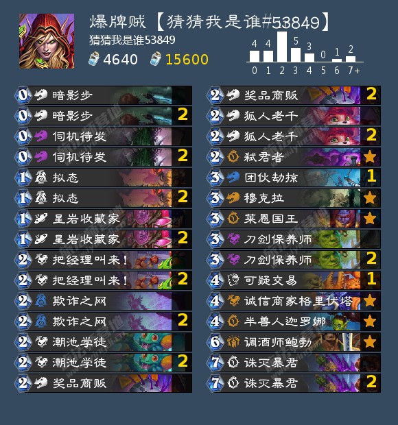 说明:今年设计师给盗贼出的卡,实在太有“牧师”的特色了,回想起五年前我也是个拿着脏牧卡组百玩不腻的玩家,对此当然爱不释手。小偷贼,顾名思义,把所有能脏对面的牌都带上了,尤其是很多人都没玩过的冷门卡:神秘变形者、王室线人、影蔽袭击者、狡猾的萨特,也搭配了常规的剽窃体系:旅社谍战+财宝猎人尤朵拉+苔丝·格雷迈恩+横夺硬抢,以及无限亡语体系:派对策划者沃娜+暗影步+导航员伊莉斯。这套面对战士胜率较高,因为有非常多的偷牌能偷到任务奖励。