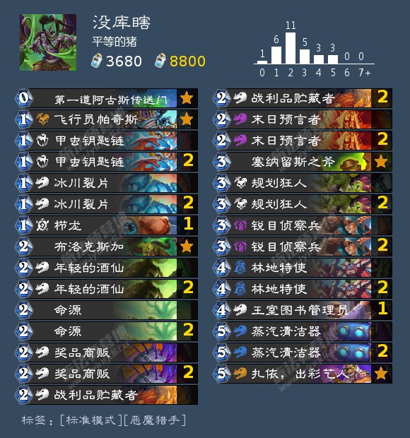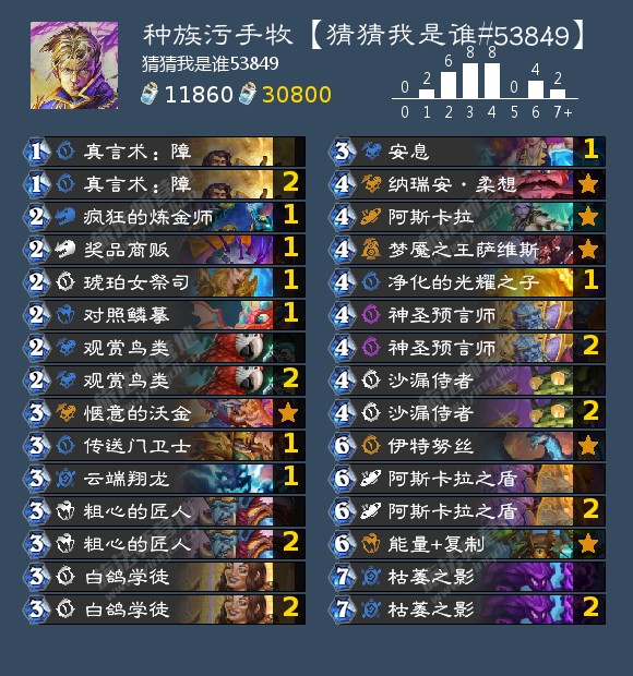 说明:这是一套常规的中速卡组,带上了个别冷门卡,通过复制高质量亡语随从来赢得场面。