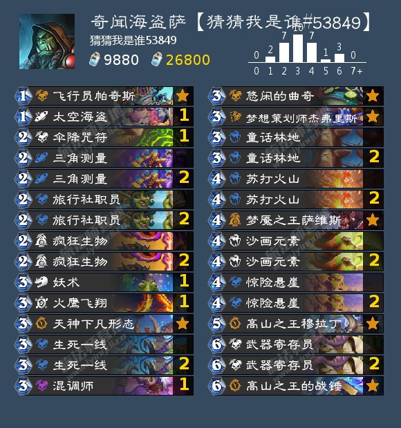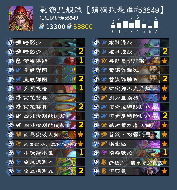 说明:在常规星舰贼的基础上,加上了梦魇供能、菊花茶具、面具变装大师、米尔雷斯,晶化镜甲龙、旅社谍战、蓄谋诈骗犯、财宝猎人尤朵拉、苔丝·格雷迈恩、阿莎曼等剽窃卡,增加趣味性,以及导航员伊莉斯+派对策划者沃娜的小combo。