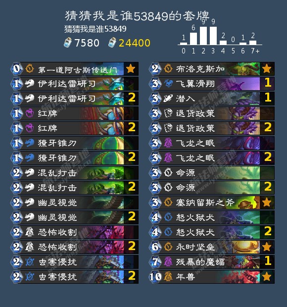 说明:这本身并不算是一套娱乐卡组,而是一套拥有正常胜率的快攻卡组。分享在这里的原因是它出现了几张大家经常不常用的卡:围攻城门、恐惧迅猛龙、安布拉的故事,显得这套构筑还是相对来说比较有创新。