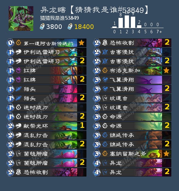 【异龙瞎】 说明:这是在命源被“削弱”之前非常强力的一套卡组,削弱之后也有可玩之处,没玩过的可以试试。主要是通过坑道虫快速检索本卡组里的唯二两张随从,通过各种低费纯法术卡抢节奏蹭血,最后通过菌毯肿瘤+虫害侵扰+绵延传承+异龙斩杀,因为组件都是可以跨回合使用的,所以当时胜率还挺高的。