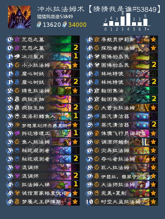 说明:卡组基本由10个拉法姆+大量2费卡+黑角组成,来自老哥魔法之翼的创意,先得保证已经使用过了1费拉法姆、2费拉法姆,再下黑角,就可以保证后面抽抽都是拉法姆,以快速达成拉法姆终结手段。