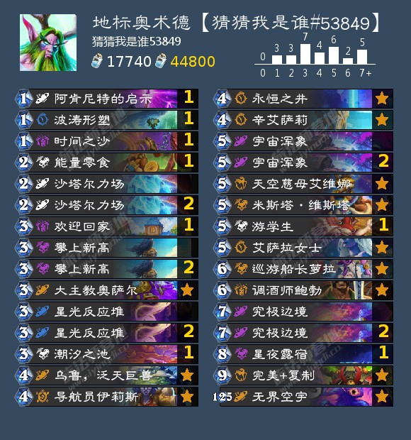 这套牌最胡的时候就是前期下星舰组件,中期下复制地标和伊莉斯地标,6~8费的时候就可以超展开了:发射星舰,然后复制发***的星舰,可以零费使用高费的奥数法术,并且让这个法术生效6~10次,效果自然是非常的夸张。