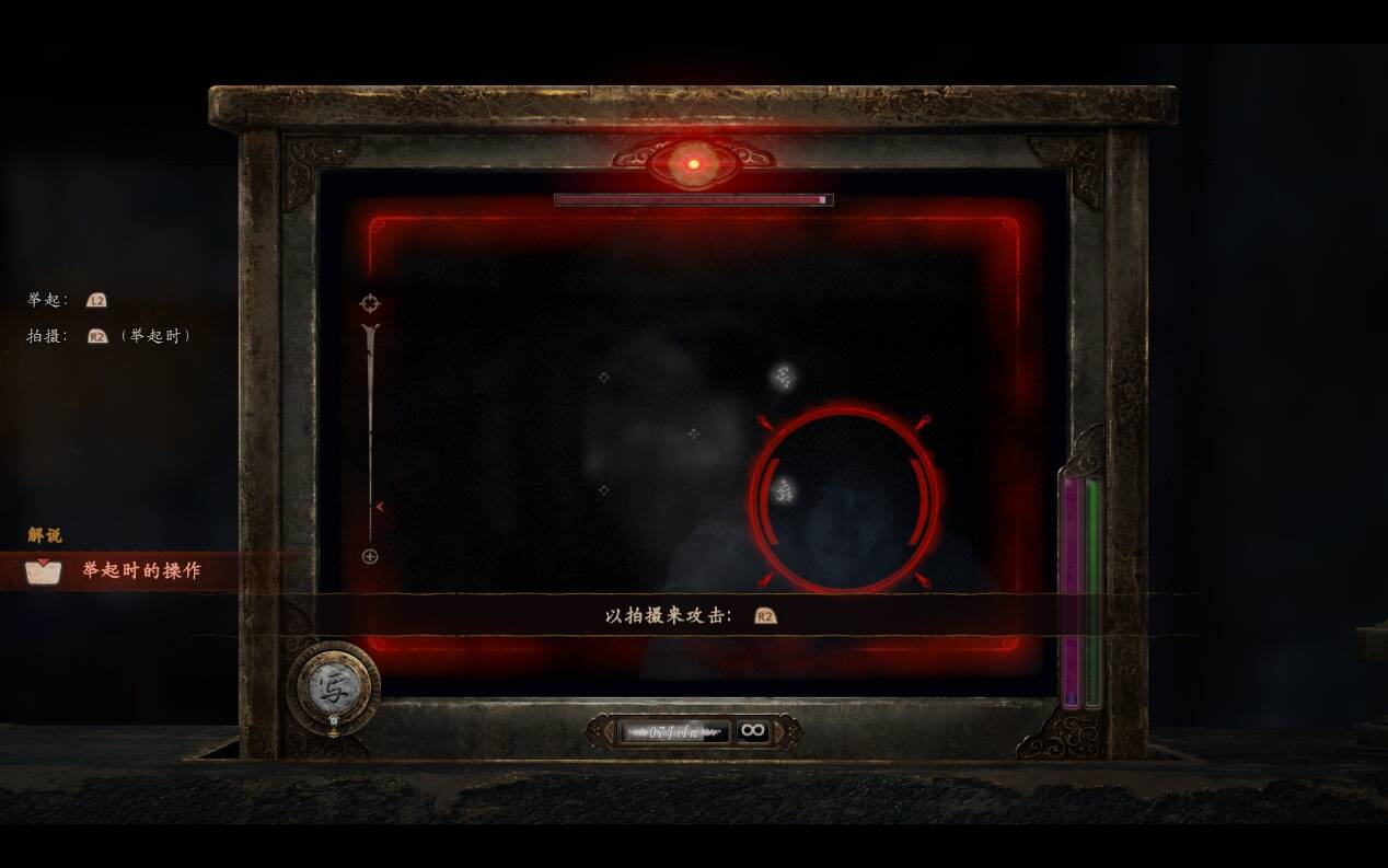 《零~红蝶》的核心设计始终围绕着一个天才般的创意展开:以相机为武器。这一设定将战斗、探索与叙事天衣无缝地缝合在一起。玩家不再拥有任何传统的攻击手段,只能透过取景器直面袭来的怨灵,在恐惧中按下快门:必须直视恐惧,才能战胜恐惧。这种让玩家“不得不永远直面怪物”的核心设计,赋予了系列独一无二的恐怖气质。它颠覆了传统恐怖游戏中“逃跑”或“躲避”的被动逻辑,转而要求玩家主动、甚至侵略性地与恐惧正面交锋。