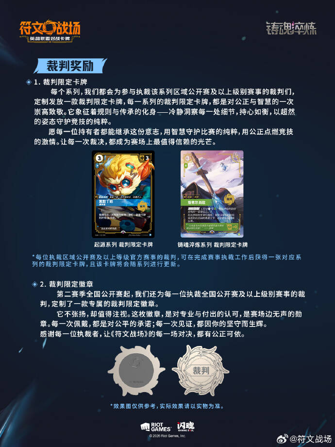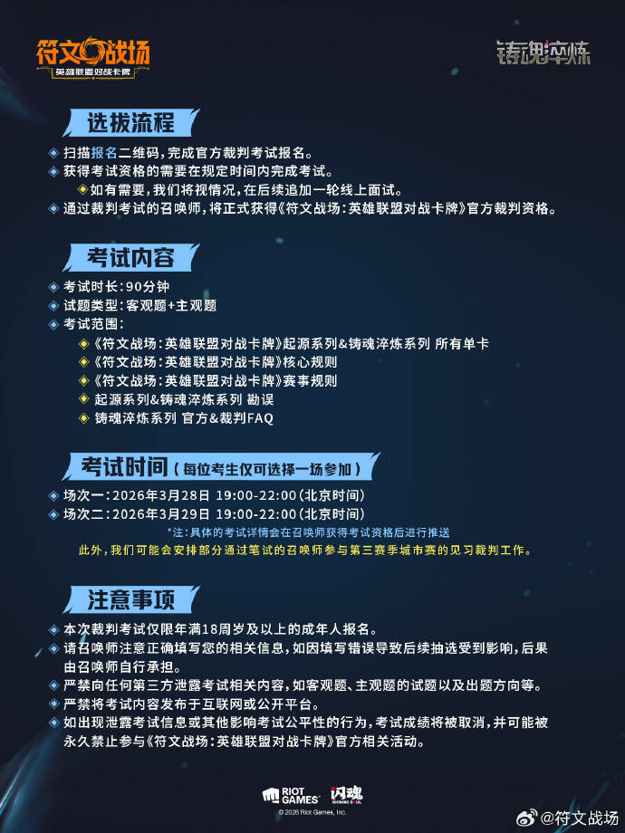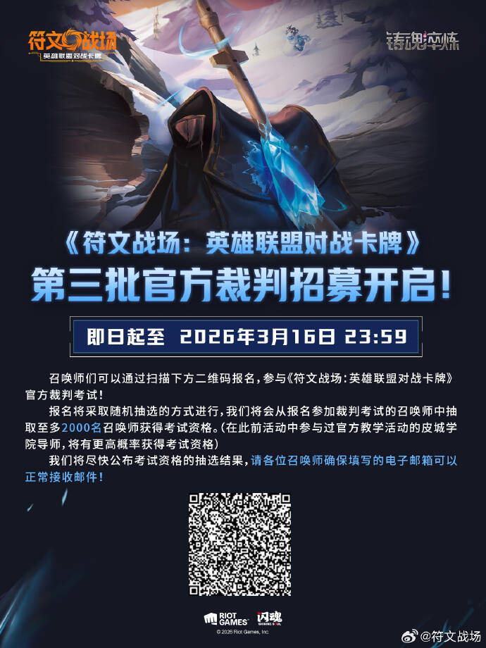 以规则之名,护公平之战。我们寻找热爱符文战场、熟悉规则、能够在纷繁战局中保持冷静判断的你,加入裁判队伍,成为赛场不可或缺的一道防线。即刻扫描下方二维码,填写报名信息。符文战场,静候诸位。*裁判限定徽章,具体发放方式敬请关注后续通知。