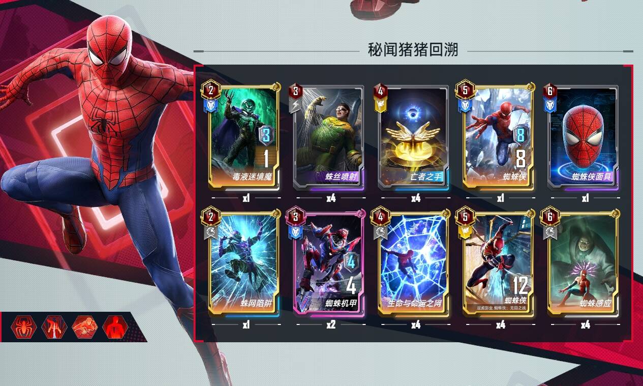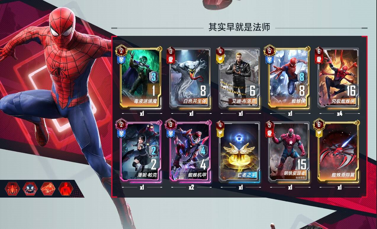 五费:蜘蛛侠和荷兰弟,蜘蛛侠不论是在手上还是场上都有作用,一张即可,荷兰弟链接核心,多多益善