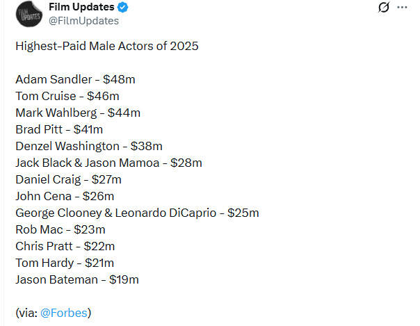 美媒福布斯发布了2025年收入最高的演员,意外的是现年59岁的亚当·桑德勒力压汤姆·克鲁斯、小李子、乔治克鲁尼登顶排行榜。