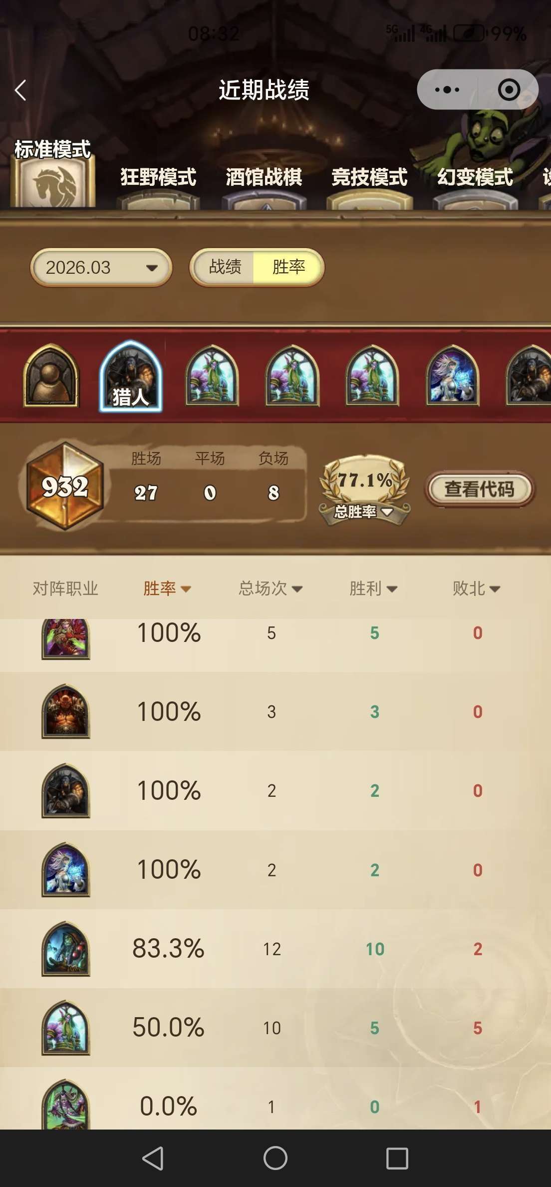 这套其实就是炉石东少前天事情推荐的第一套T7猎,我把牧人之杖换成了快速射击。带了3姐妹清场很有用,没带狼王进一步压低费用,带了1张爆裂射击和1张快射,前者打德萨有用,后者补伤害过牌,在231不上手的情况下是一张好补牌。胜率很可观,其实打德也是优的,10把虽然5-5但排除上面所说的2把也是优。而且很快,平均六七分钟就结束战斗。希望大家都能上传说!月末上分愉快!