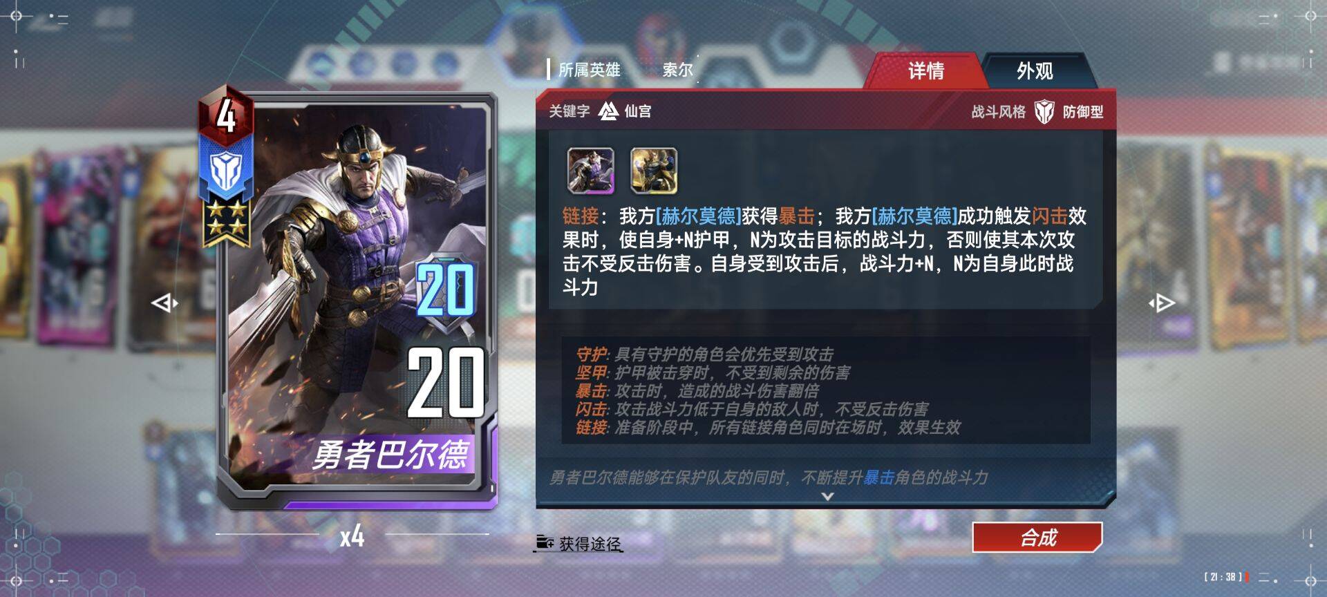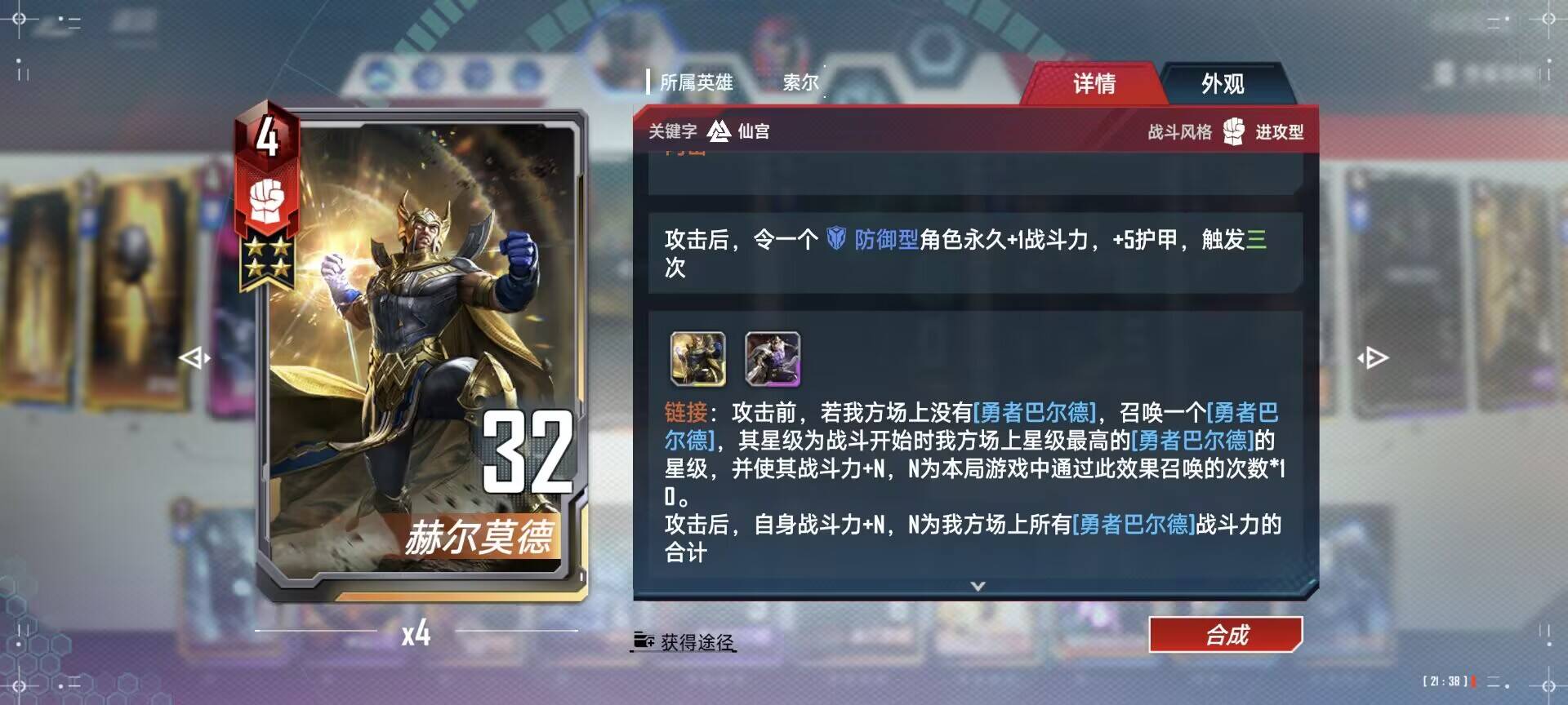 - 4费:异界白皇后则是我们的另一张重要的辅助牌,刚好可以和赫尔莫德、隐匿装甲组成三联,三联的效果可以让隐匿装甲和白皇在行动后都可以均分护甲给我们的巴尔德,不用依赖赫尔莫德的行来提供护甲,大大提升了巴尔德的存活率,而巴尔德又是依靠受击来加战力的,这样就可以轻松把身材指数增长到电话号码。1、2、4张都可以。