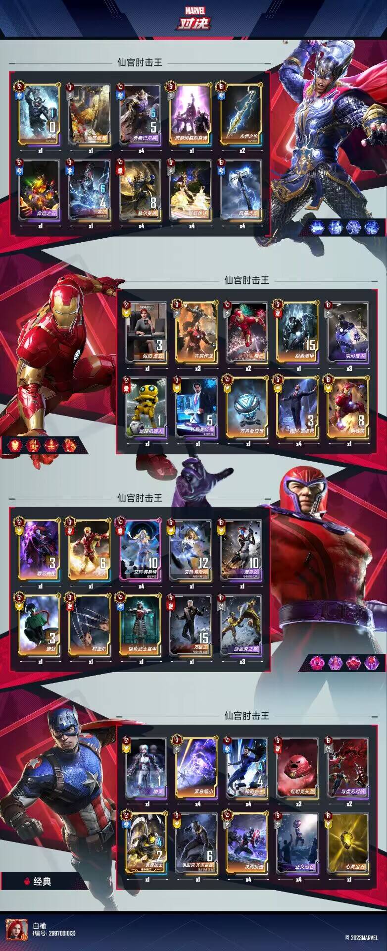 以上就是必不可少的几个卡组核心,主要利用四费牌的行动出发神奇先生的链接和赫尔莫德两兄弟的互刷增长身材。至于索尔和钢铁侠非核心牌以外的牌,基本都是常用的过渡手段和经济组件,就不多介绍了,主要介绍一下我第三个英雄选用万磁王的思路
