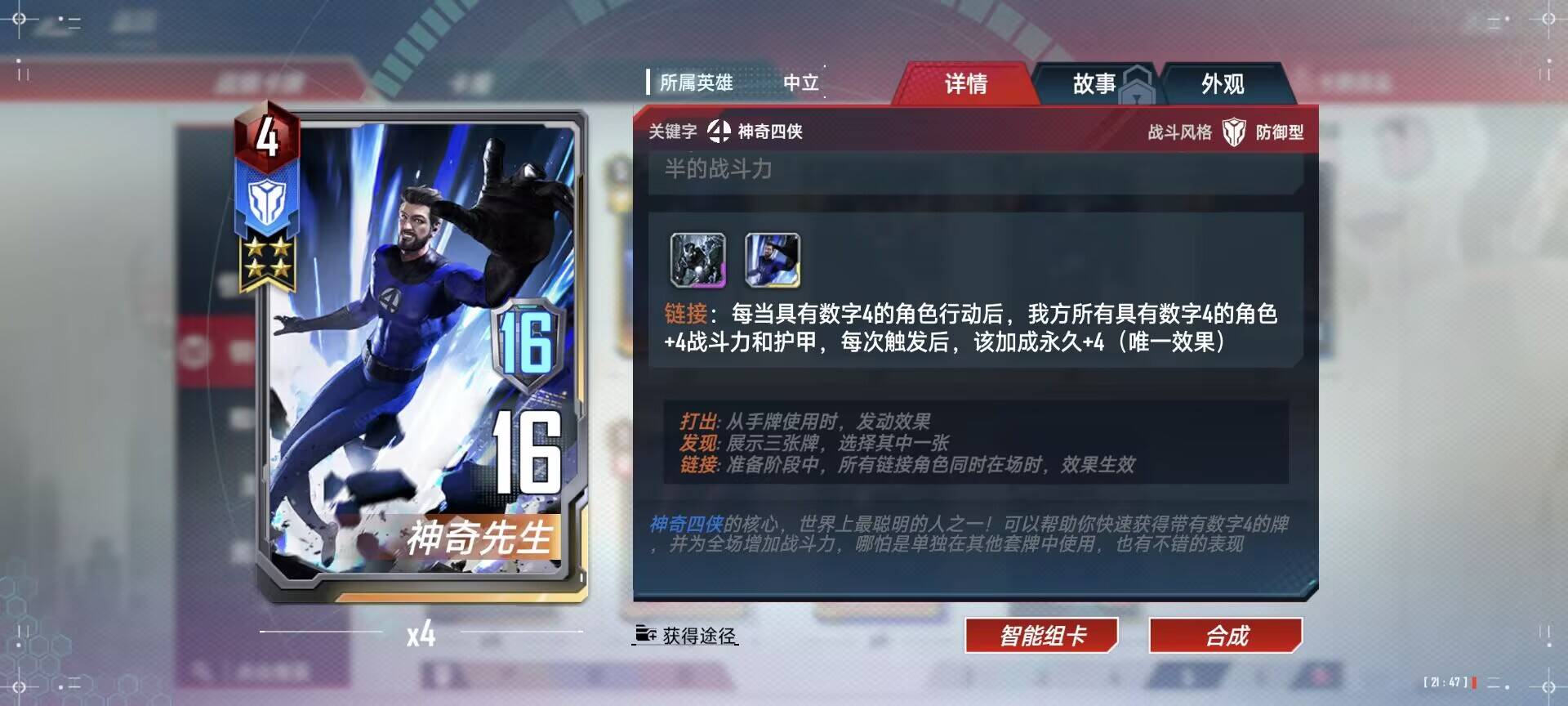 - 4费:神奇先生其实一张就完全可以玩这套卡了,不过毕竟打出有经济有战力,还有可能出一些意想不到的有用卡牌,所以还是尽量多带。加血也要拉满,提高容错。