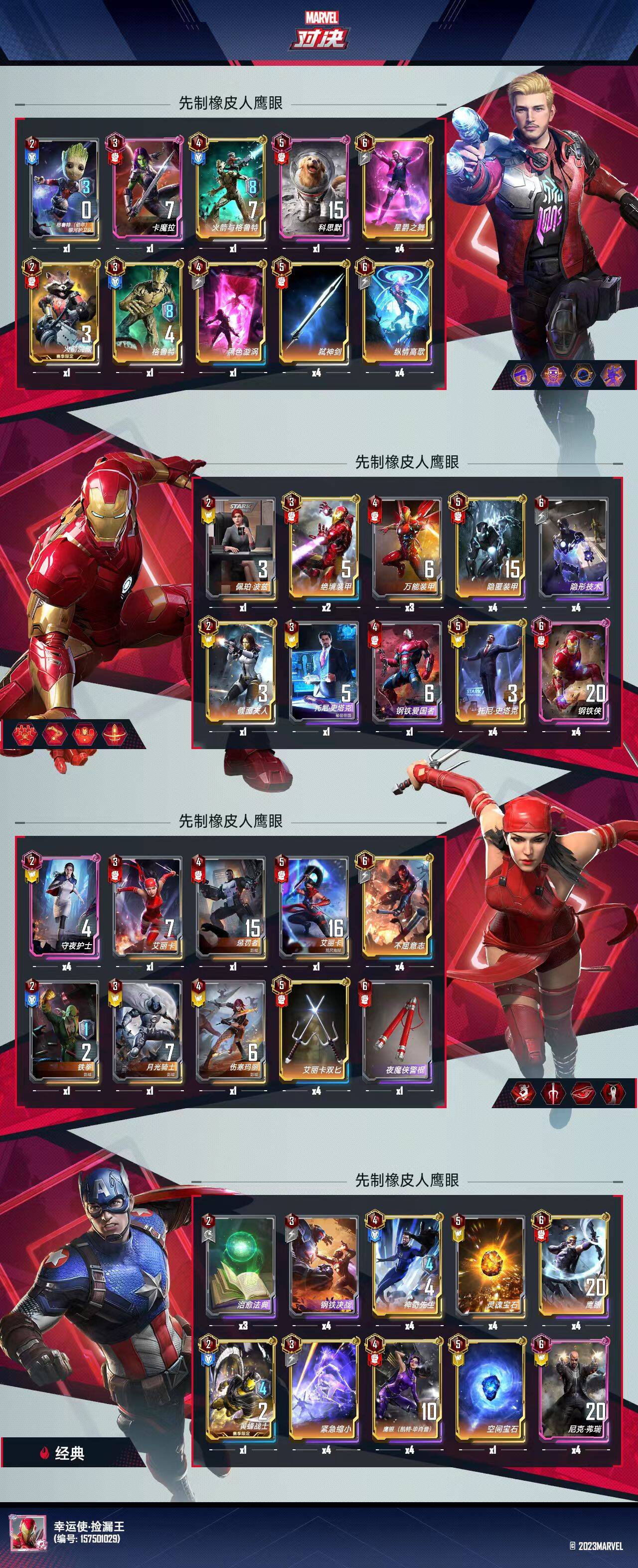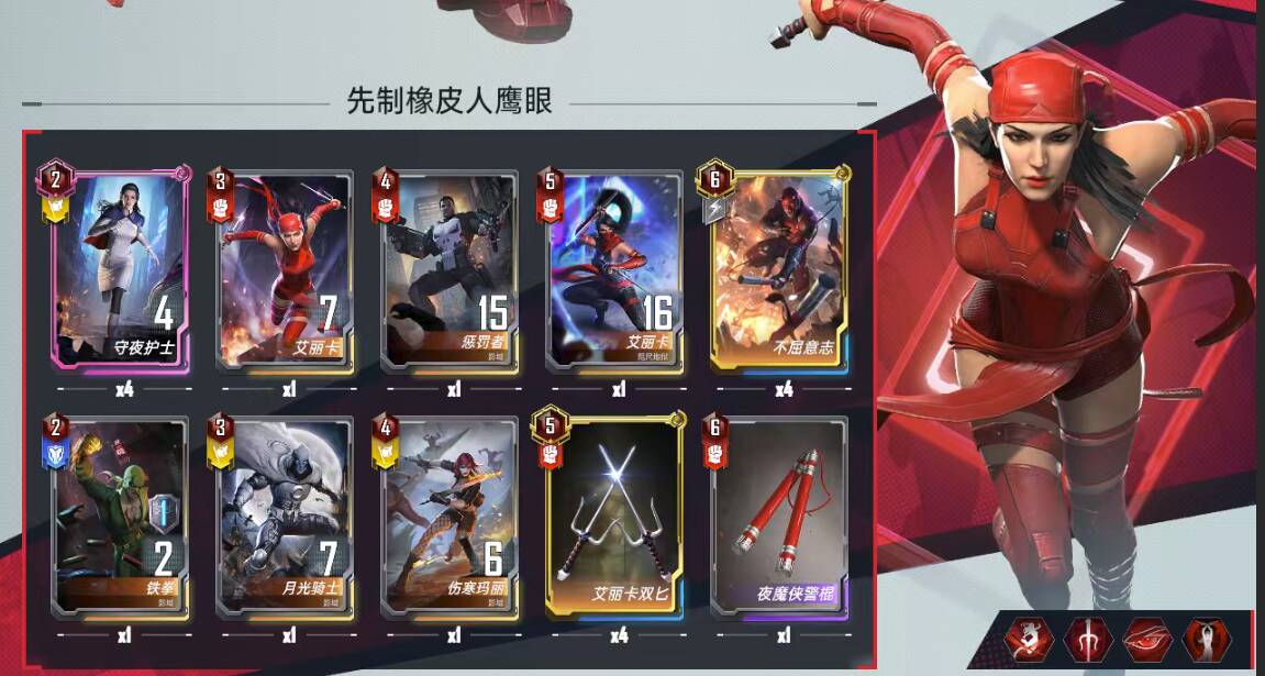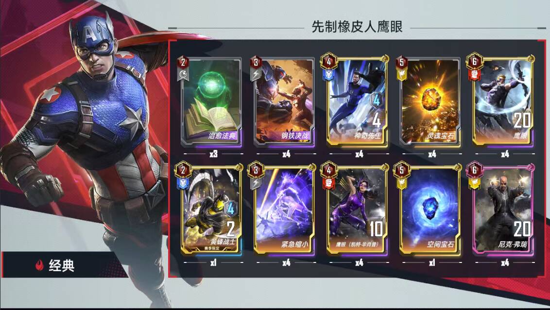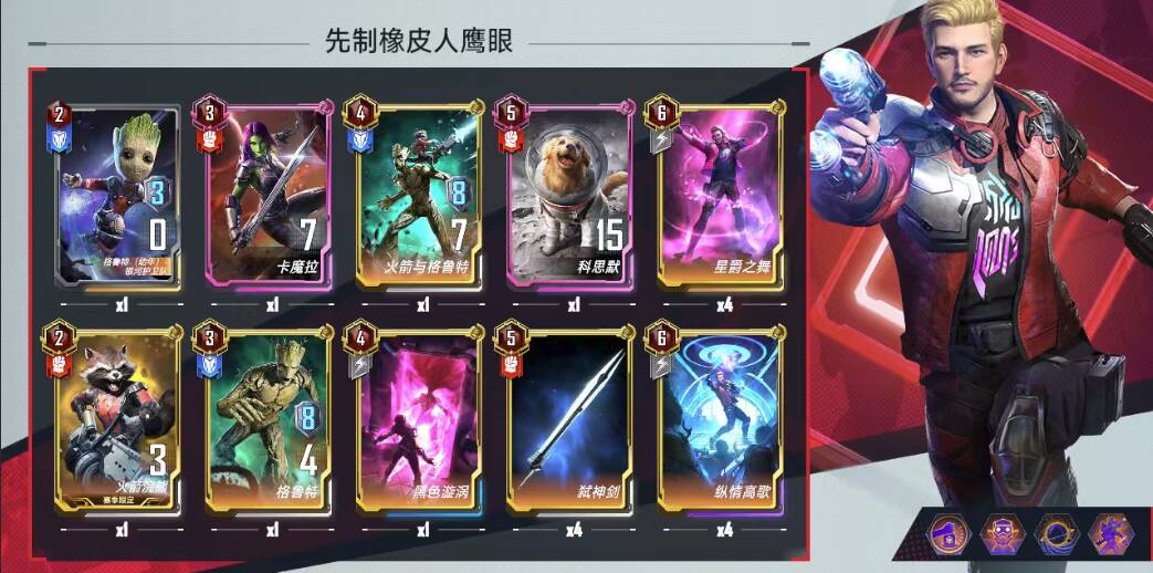 四费:万能,场上2+1,核心关键卡;爱国者,凑数,有时候直接给橡皮人或者万能、鹰眼