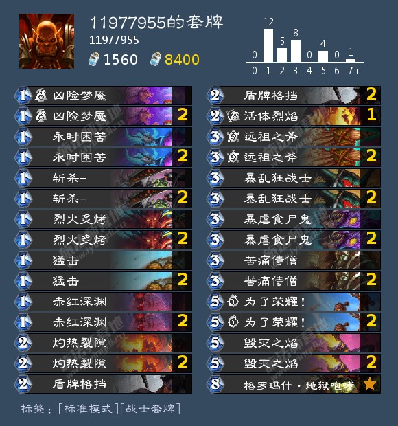 如题,在钻五玩这套地沟油慢慢到钻二了。前期各种大小aoe单解过牌混着,中期一波奴隶主展开,配合暴乱狂蹭血,后期吼爹收头
