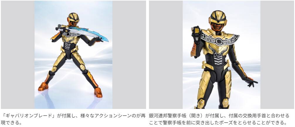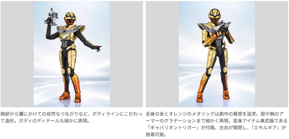 胸部から腰にかけての自然なつながりなど、ボディラインにこだわって造形。ボディのディテールも細かに表現。全身の金とオレンジのメタリックは劇中の質感を追求。変身アイテム兼武器である「ギャバリオントリガー」が付属し、「エモルギア」が脱着可能。「ギャバリオンブレード」が付属し、様々なアクションシーンが再現できる。銀河連邦警察手帳(開き)も付属。